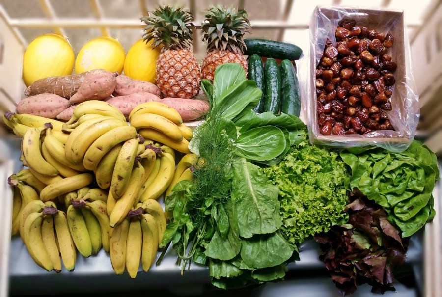 garde-manger végétalien végane bananes melons ananas laitues dattes patates douces