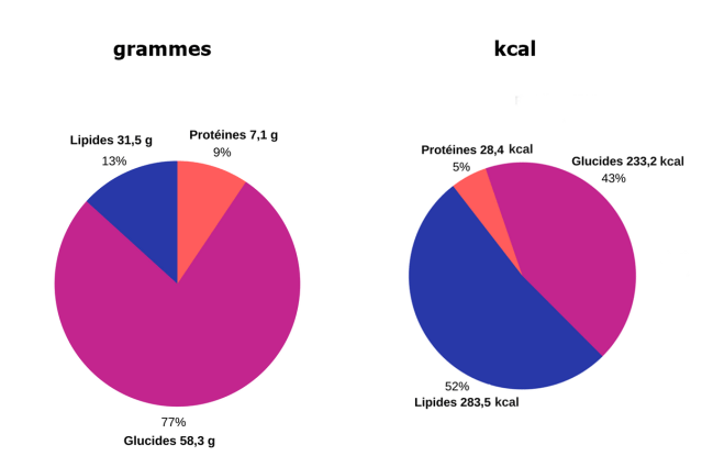 Bien que les lipides pèsent moins lourd que les glucides dans ce produit, les lipides représentent davantage de calories que les glucides. Ce produit semble de prime abord composé de glucides majoritairement, alors que la majorité de ses calories sont des graisses.