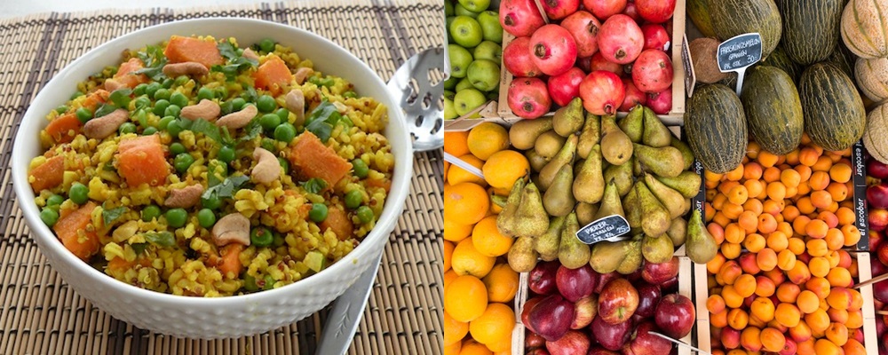 Choisir des aliments provenant de sources végétales : cela réduit l’apport en graisses, augmente les protéines végétales, augmente les fibres et augmente des milliers de phytonutriments améliorant la santé ; grains (8 portions par jour), légumineuses (3), légumes (au moins 4) et des fruits (au moins 3).