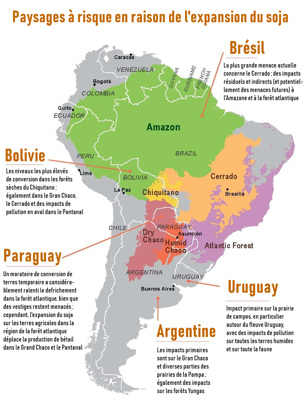 En 2016, les États-Unis, le Brésil, l’Argentine et le Paraguay ont produit 85 % du soja du monde. La culture du soja implique souvent d’expulser les peuples indigènes et de détruire de grandes surfaces d’habitat naturel, pleines de biodiversité, pour laisser place à d’immenses terres agricoles. Dans tous ces pays, la culture du soja se déroule au détriment des peuples indigènes, des prairies naturelles et des forêts. La biodiversité est en déclin dans les régions tropicales. D’après l’indice de la planète vivante (LPI) de la WWF, les populations d’espèces dans les régions tropicales ont chuté de 60 % en moyenne depuis 1970.