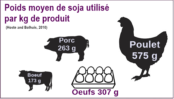 La farine de soja est utilisée principalement pour la volaille et le porc, mais également pour le bœuf, les exploitations laitières et le poisson d’élevage. Elle est généralement mélangée avec du maïs, de l’orge et d’autres céréales. D’après l’Association internationale d’alimentation animale (IFIF), à l’échelle mondiale en 2016 environ 1,3 milliard de tonnes de céréales fourragères, 242 millions de tonnes de farine de soja et environ 160 millions de tonnes d’autres farines d’oléagineux ont été utilisées pour nourrir les animaux d’élevage. De plus, un nombre stupéfiant de 2,3 milliards de tonnes d’herbe et de luzerne et 1,1 milliard de tonnes d’autres cultures (légumineuses, navets, chou frisé, etc.) ainsi que de tiges et de feuilles (les restes des grandes cultures) sont consommés par des animaux d’élevage. Mais avec tous ces intrants, l’agriculture animale internationale a produit seulement 310 millions de tonnes de viande (2016), 789 millions de tonnes de lait (2014) et 70 millions de tonnes d’œufs (2014). Si l’on songe seulement aux calories perdues des céréales et des fèves de soja, l’agriculture animale arrive à convertir assez d’aliments sains pour 7,5 milliards d’humains en assez d’aliments malsains pour 1,5 milliard d’humains en nourrissant d’abord les animaux d’élevage avec.
