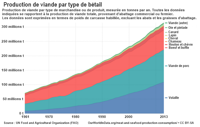 Environ 75 % du soja du monde entier, et 93 % du soja importé vers l’Europe, sont utilisés pour nourrir les animaux. Entre 1967 et 2007, la production de porc a augmenté de 294 %, la production d’œuf de 353 % et la production de volaille de 711 % (FAO, 2011), tandis que la consommation de bœuf par personne est restée relativement stable. Le schéma ci-dessous montre la croissance explosive de la consommation de volaille et de porc de 1961 à 2013. La moyenne mondiale qui était de 10 kg de porc et de volaille par personne par an par personne est passée à 30 kg alors que la population a augmenté de 4 à 7,5 milliards, la production de porc et de volaille est passée de 40 à 225 millions de tonnes de viande par an. À l’échelle mondiale, la capture de poissons sauvages continue de décliner, tandis que l’aquaculture, en particulier en Asie, est devenu un autre utilisateur de soja.