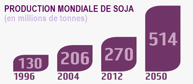 Le soja a seulement un potentiel limité pour les augmentations du rendement, en partie du fait de sa nature de fixateur d’azote biologique, qui le rend très insensible aux engrais ; entre 1995 et 2011 les rendements totaux des fèves de soja ont augmenté de seulement 1 % dans les pays producteurs majeurs. Donc tout hausse dans la consommation entraînera une extension des surfaces cultivées servant à cultiver du soja. La WWF estime une hausse atteignant 200 millions d’hectares d’ici 2050. Si l’on considère la productivité mondiale moyenne, cela nécessiterait une surface colossale de deux millions de km².