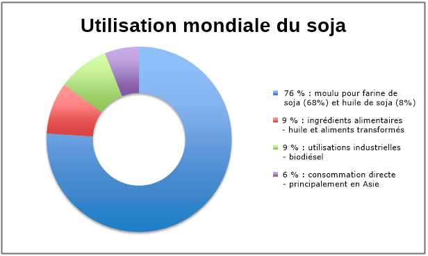 De nombreuses personnes croient à tort que le soja est mangé par les végétaliens et les végétariens, mais les mangeurs de viande consomment en réalité 85 % du soja de façon plutôt indirecte sous forme de viande, mais également sous forme d’ingrédient dans des aliments transformés et sous forme d’huile de cuisson. Le schéma ci-dessous résume les utilisations mondiales des fèves de soja.