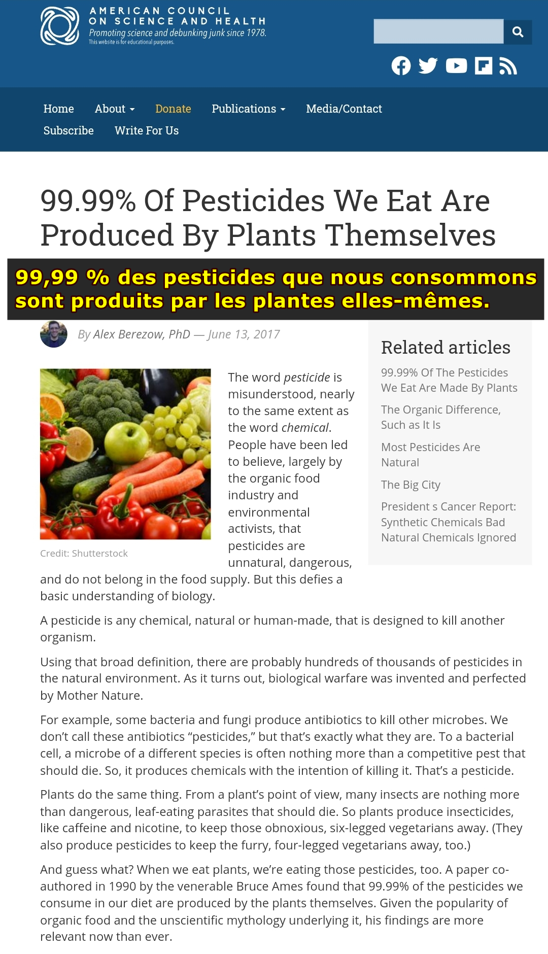 La réalité n’aurait rien à voir avec cela, car les plantes produisent 99,9 % des pesticides que l’on mange.