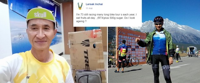 « J’ai 73 ans, je fais encore des compétitions de cyclisme chaque année, je mange des fruits tous les jours (RawTill4) plus 500 grammes de sucre. Ai-je l’air de vieillir ? » – Lersak Inchai