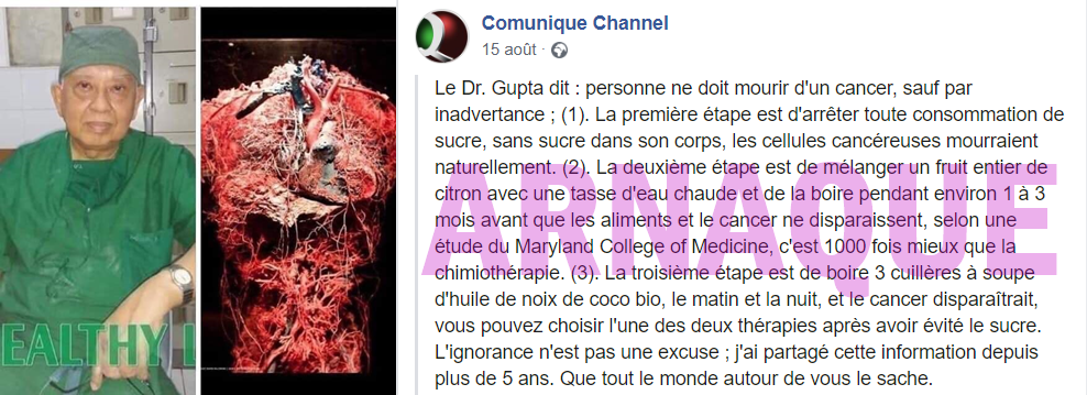 Cela commence généralement ainsi : « Le Dr Gupta dit que personne ne doit mourir du cancer, sauf par inadvertance. » Ce genre de publication a été partagé des centaines de milliers de fois sur différentes pages et en de nombreuses langues.