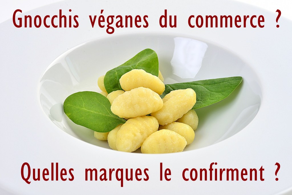 - Migros – Ils ont quatre gnocchis certifiés véganes : Gnocchi aha! ; M-Classic Gnocchi aux pommes de terre 550g ; Bio Girasoli vegani spinaci 250g ; Bio Girasoli vegani verdure grigliate 250g.