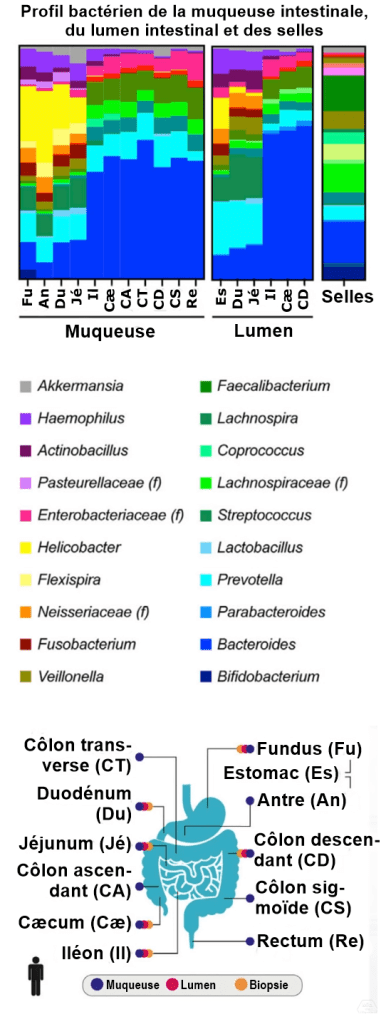 Les études optimistes sur les probiotiques se basent sur l’analyse des selles, en supposant que ces selles reflètent les populations de bactéries dans les intestins. Mais ce n’est pas la même chose. En effet, les proportions des différentes bactéries dans les selles ne sont pas les mêmes que celles dans les intestins, comme le montre le graphique ci-dessous.