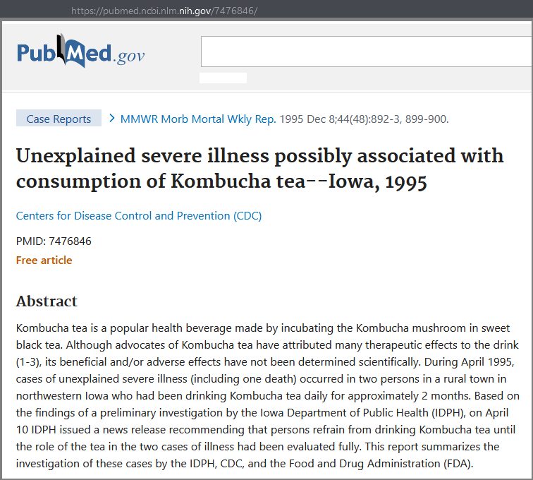 • Unexplained severe illness possibly associated with consumption of Kombucha tea—Iowa, 1995. From the Centers for Disease Control and Prevention. JAMA. 1996;275:96-98.