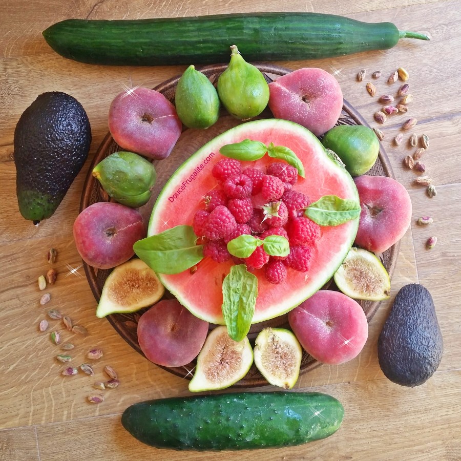 Art de fruits – pastèque, figues fraîches, pêches des vignes, concombres avocats, framboises et feuilles de basilic et d’oseille