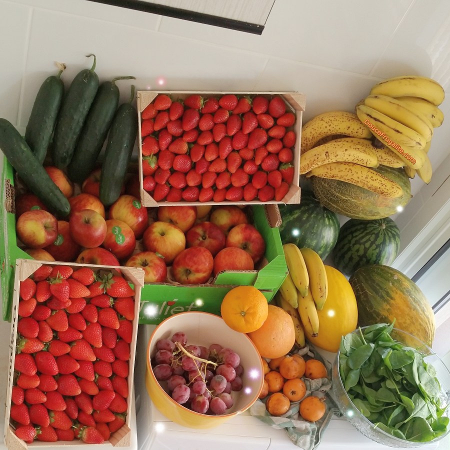 Garde-manger gourmand ; concombres, pommes, fraises, bananes, pastèques, melon vert, pourpier, melon jaune, nèfles, oranges et raisin rosé