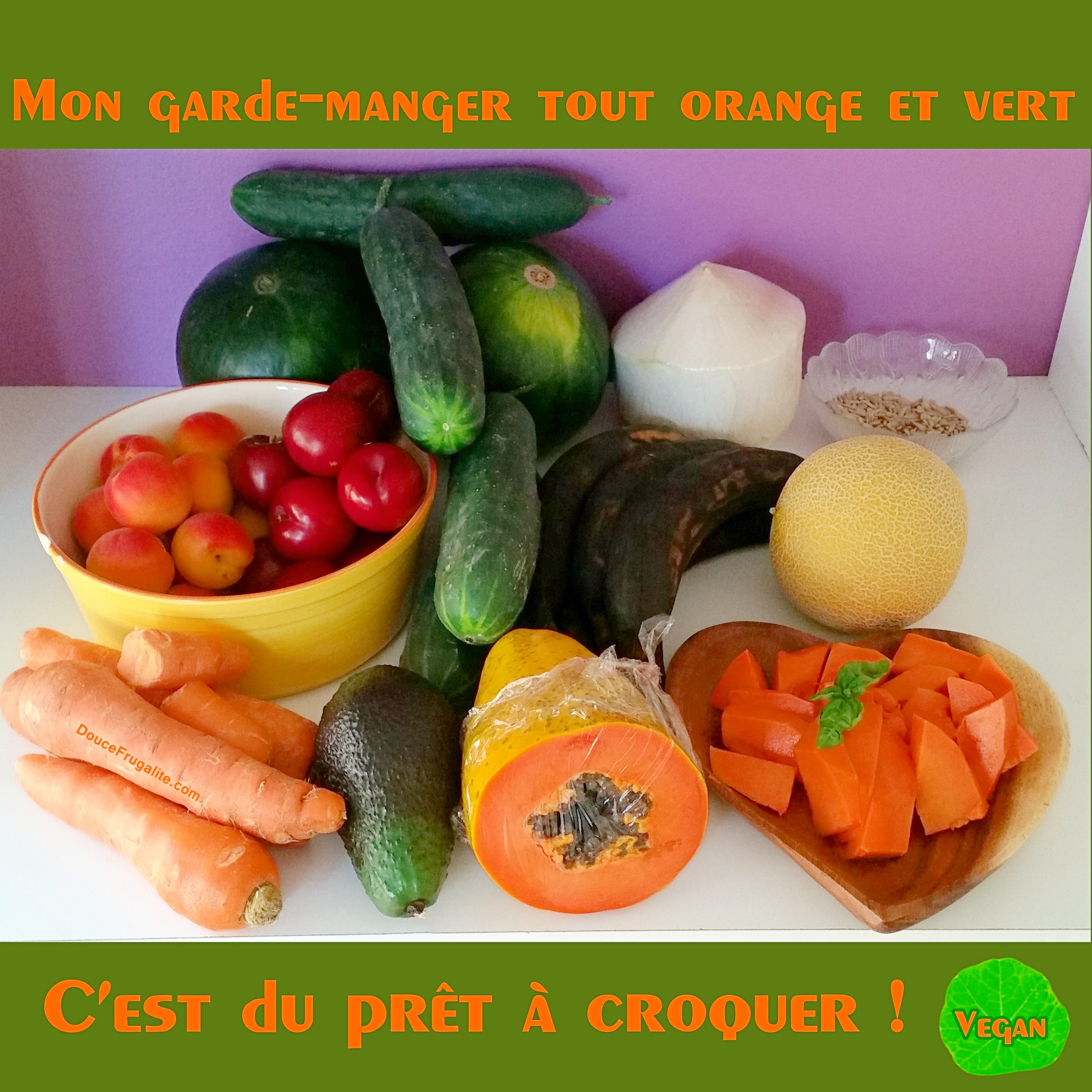 Garde-manger végétalien – concombres, papaye, carottes, prunes, abricots, avocat, noix de coco fraîche, banane plantain, melon et graines de tournesol