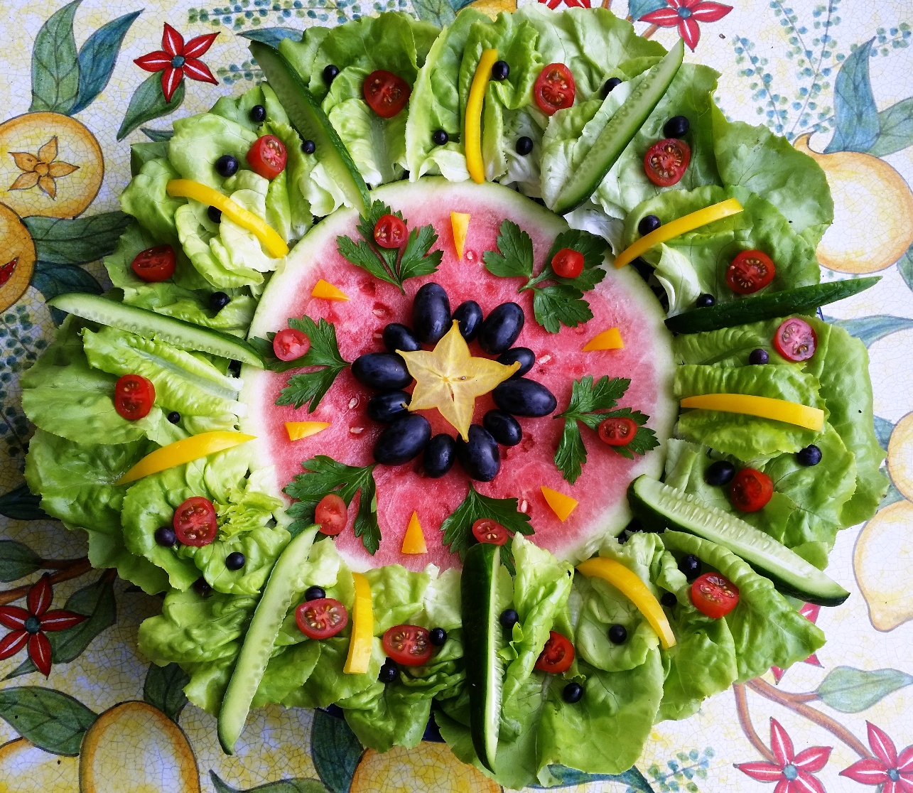 Mandala de fruits – pastèque, salade, raisin noir, poivron jaune, mini-concombre, tomate-cerise