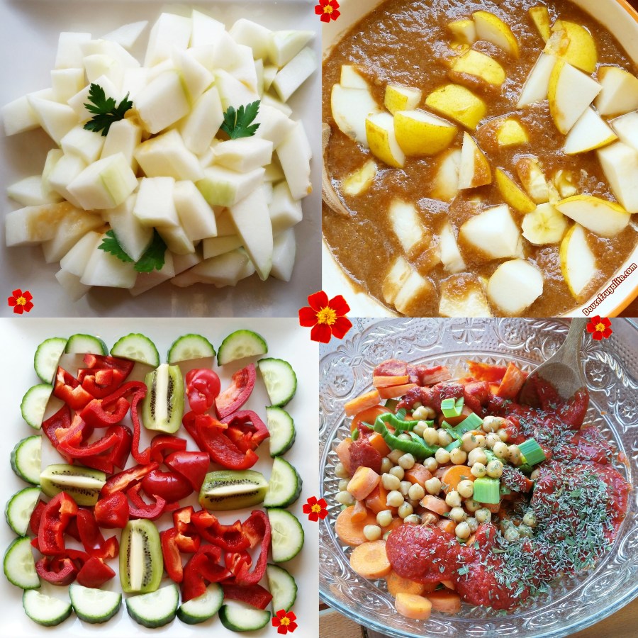 melon piel de sapo, poires, crème caroube-banane, poivron, concombre, salade pois chiches, tomate, carottes, herbes de provence