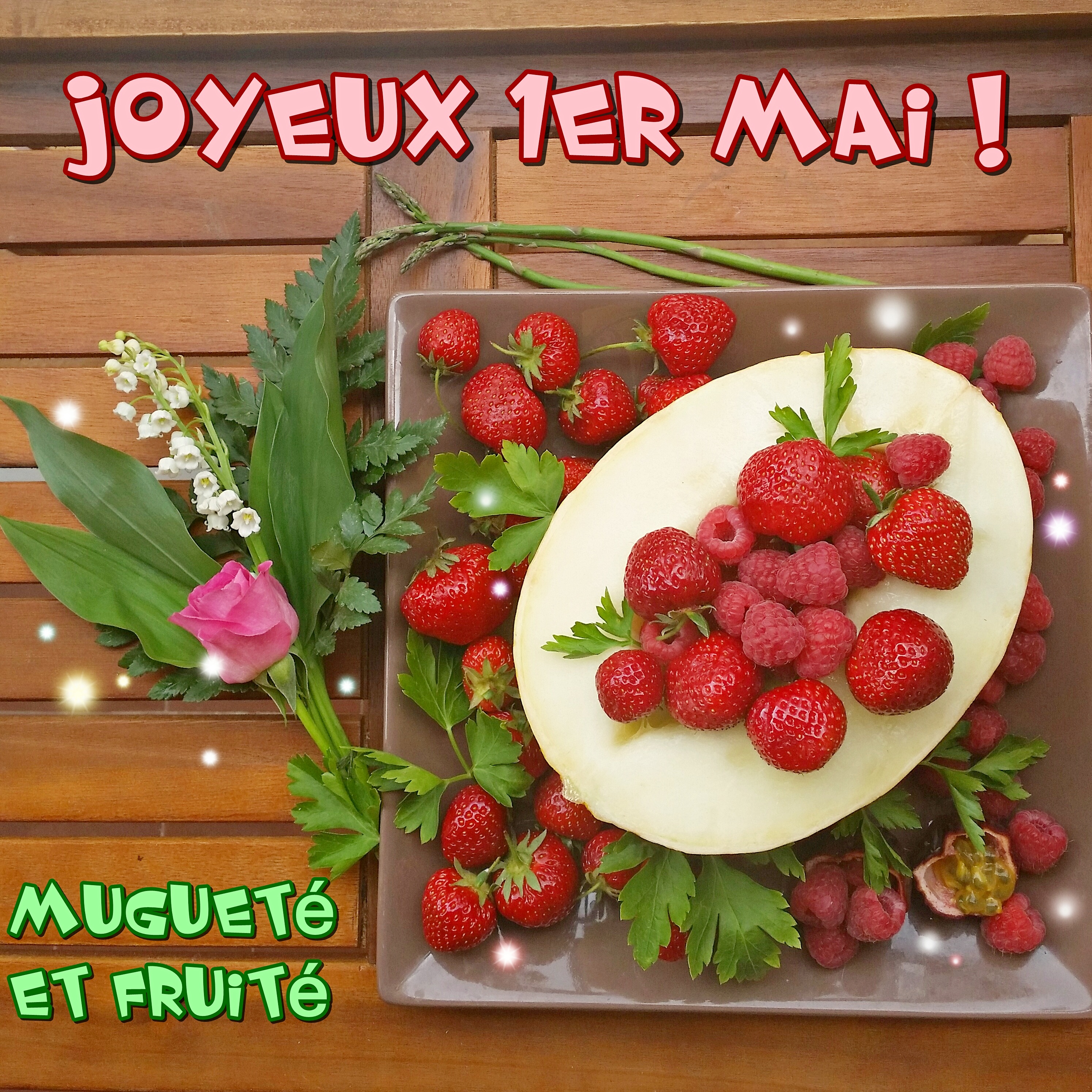 Muguet le premier mai, avec melon jaune, fraises et framboises