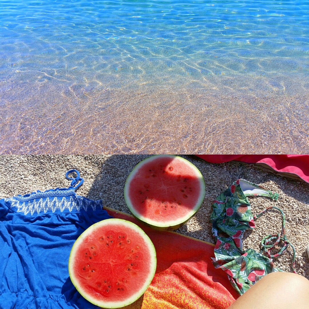 Pastèques et haut de maillot de bain à la mer