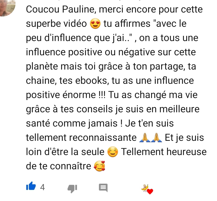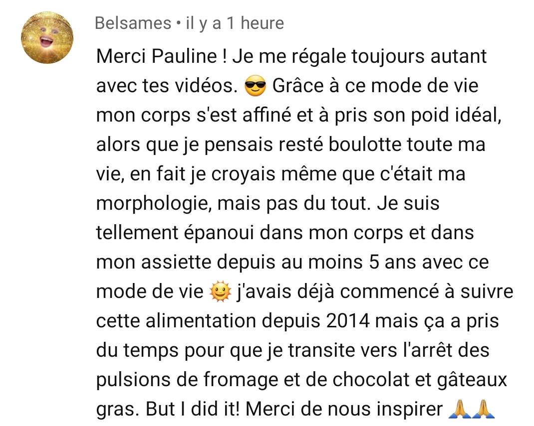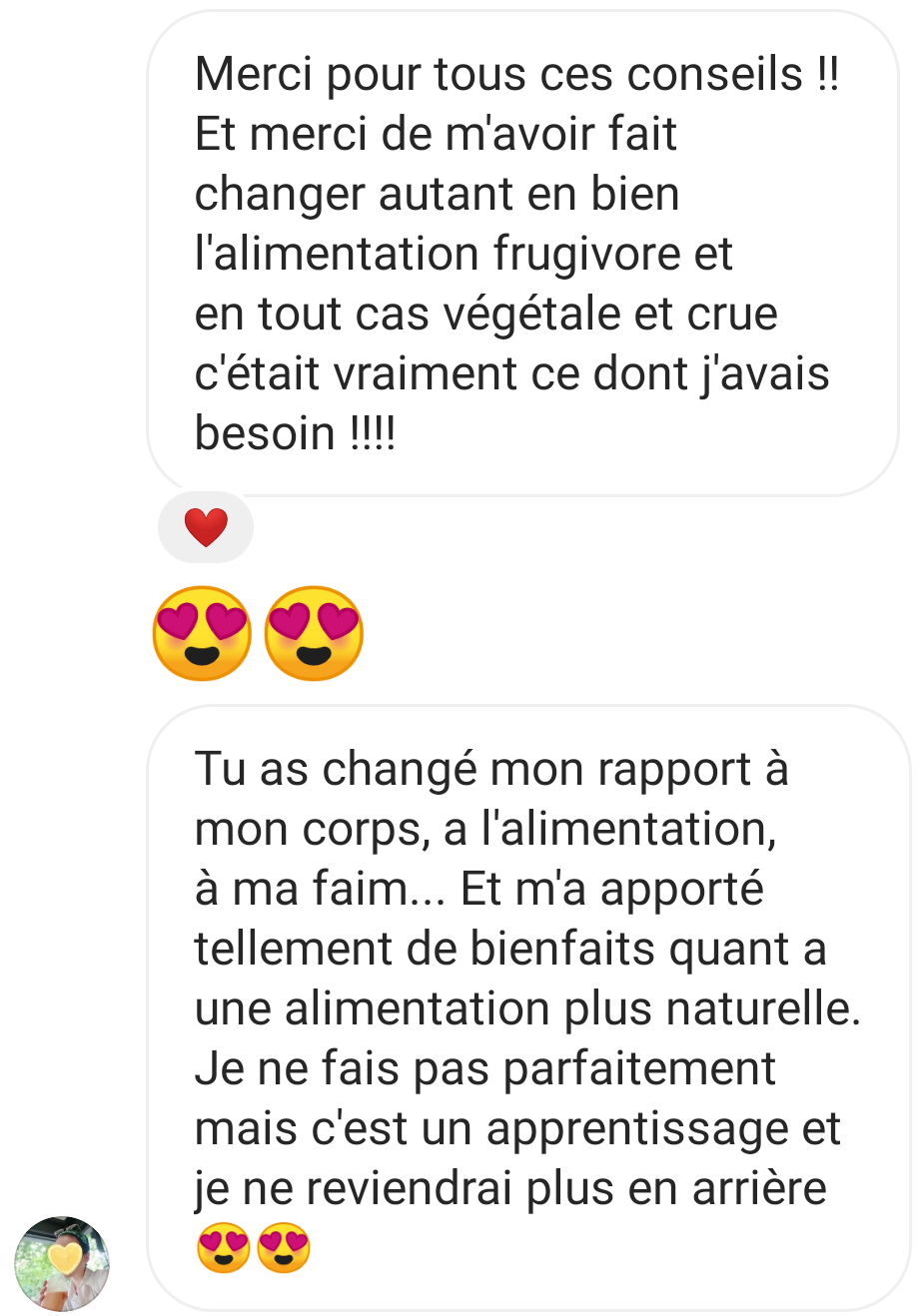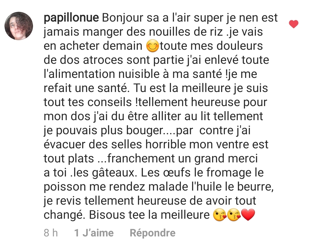 Je tenais absolument à t’écrire pour plusieurs raisons, mais surtout principalement pour te remercier de t’exprimer sur les réseaux sociaux et de nous partager non seulement de jolies valeurs éthiques mais également de nous permettre d’avoir une meilleure alimentation, car aujourd’hui je peux le dire tu m’as aidé dans le passé, tu m’aides aujourd’hui et je pense que tu ne cesseras de m’aider 🥰