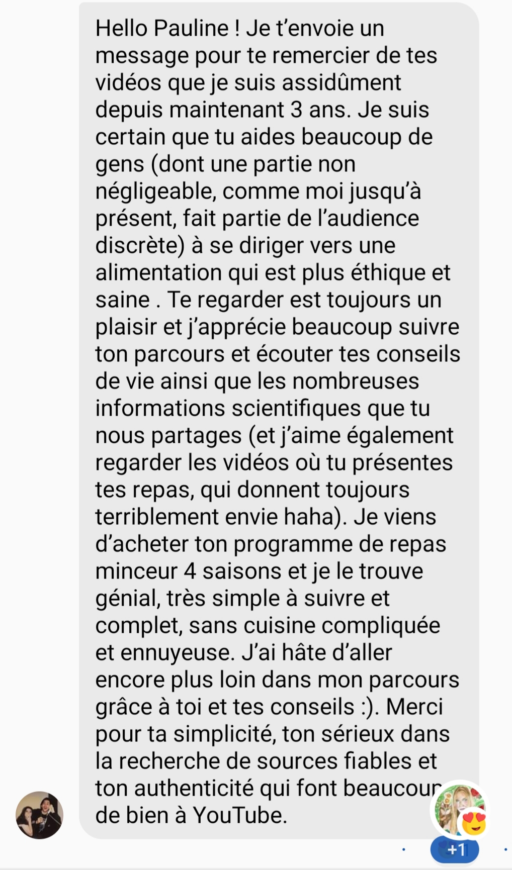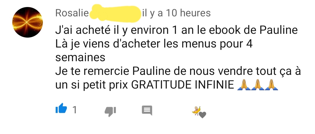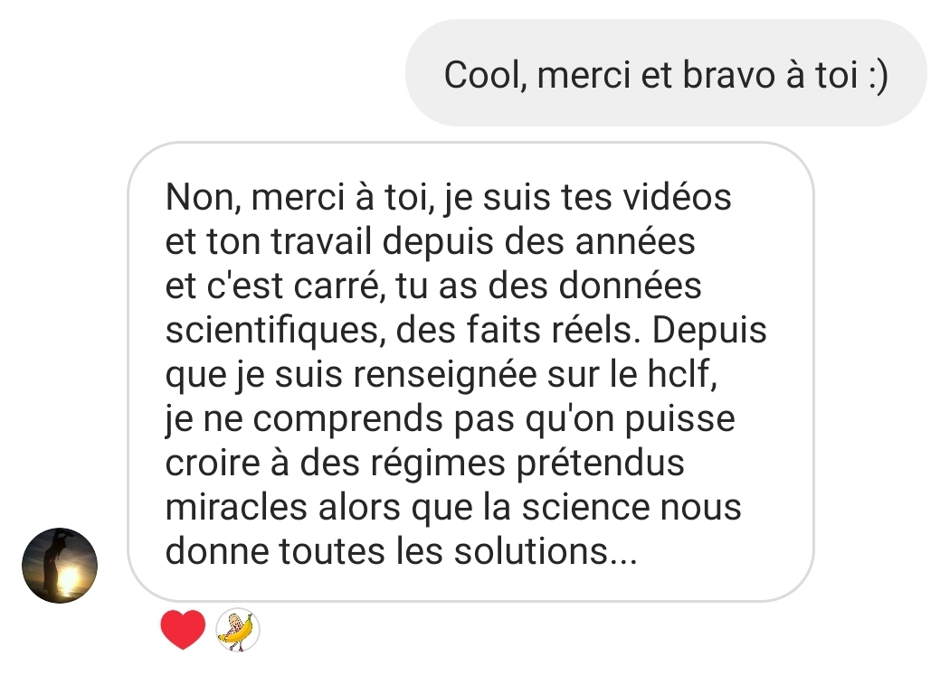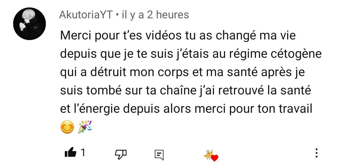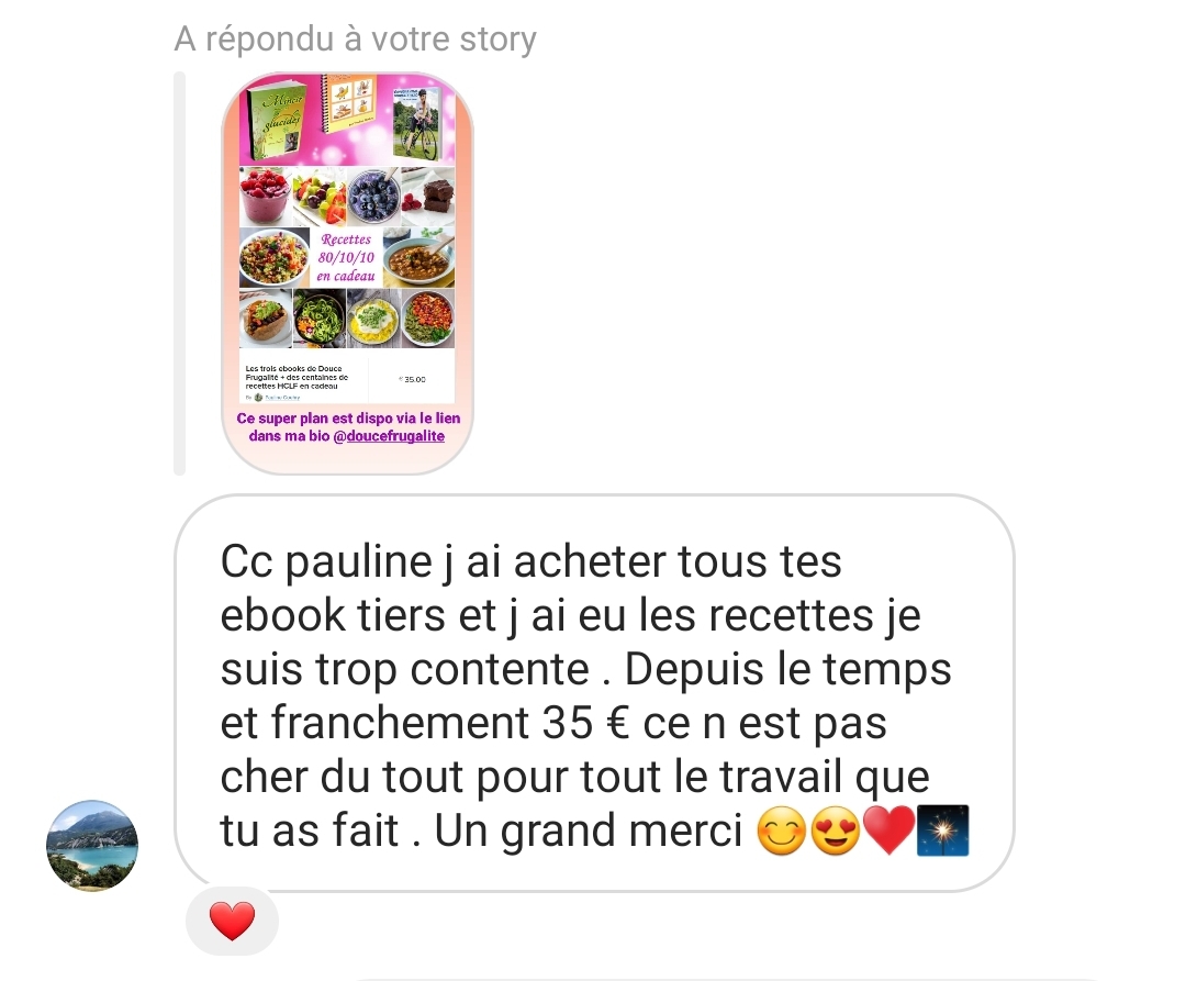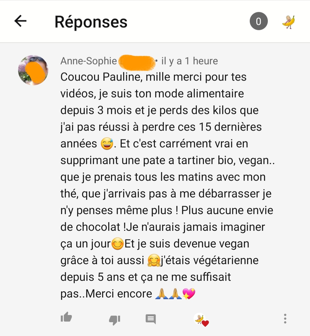 Je tenais absolument à t’écrire pour plusieurs raisons, mais surtout principalement pour te remercier de t’exprimer sur les réseaux sociaux et de nous partager non seulement de jolies valeurs éthiques mais également de nous permettre d’avoir une meilleure alimentation, car aujourd’hui je peux le dire tu m’as aidé dans le passé, tu m’aides aujourd’hui et je pense que tu ne cesseras de m’aider 🥰