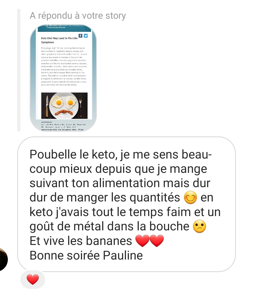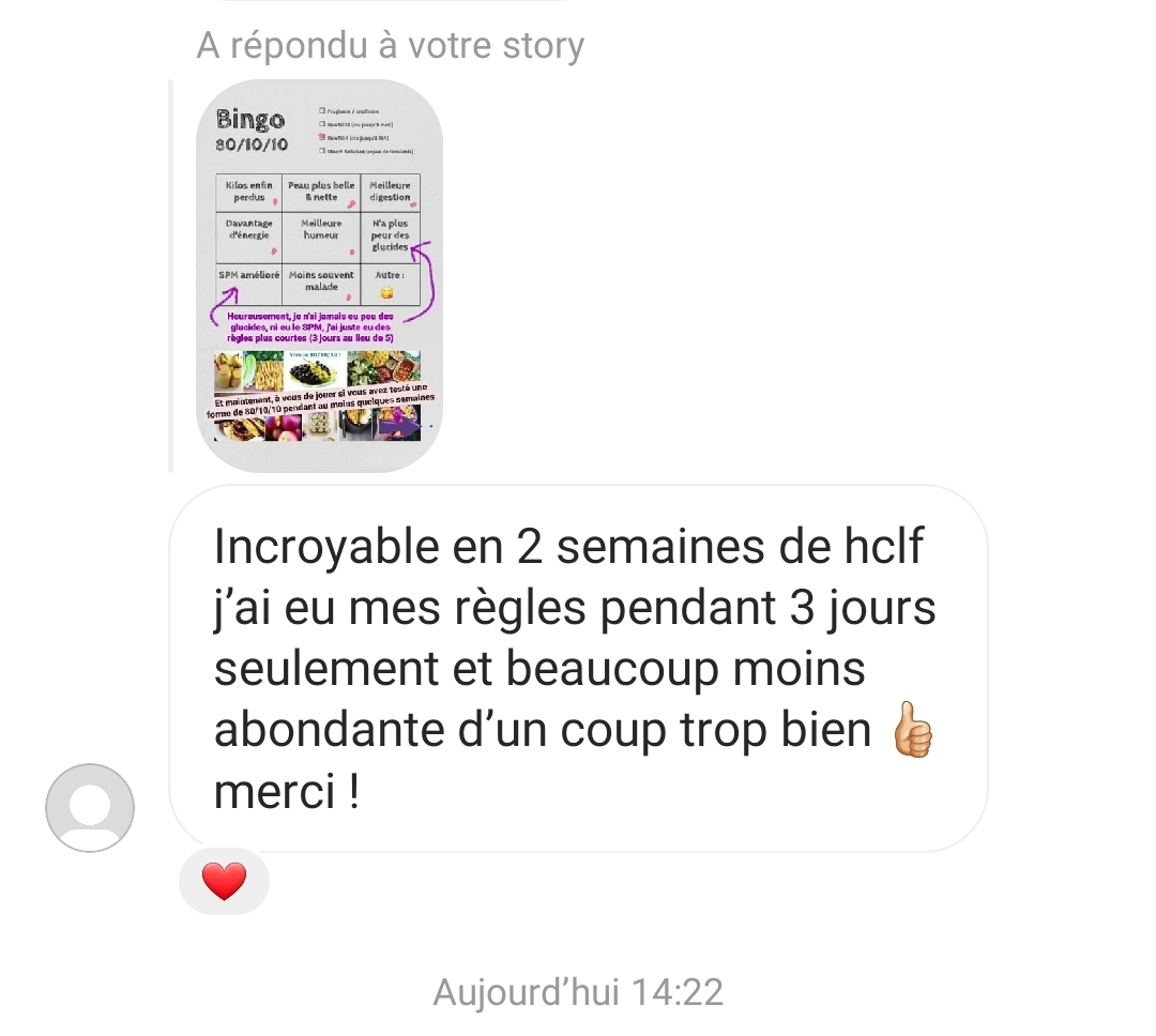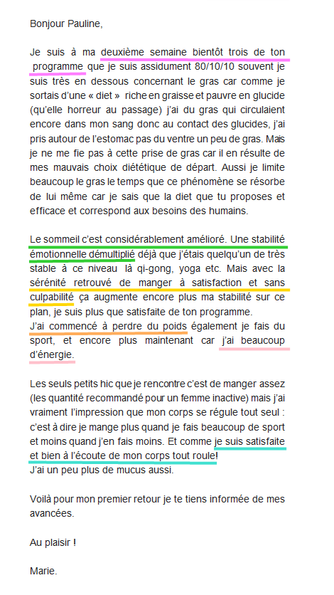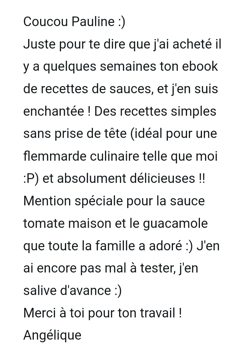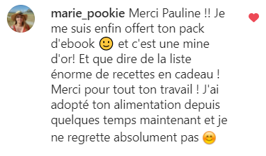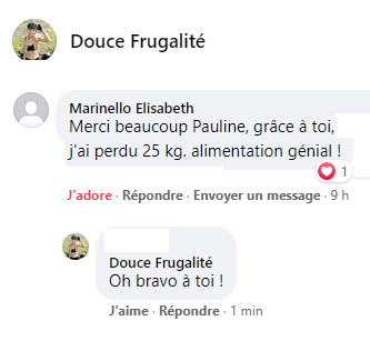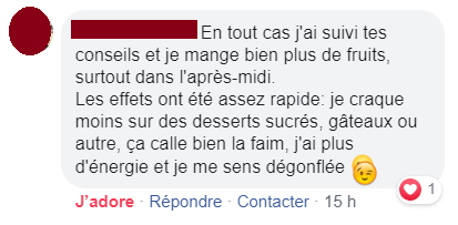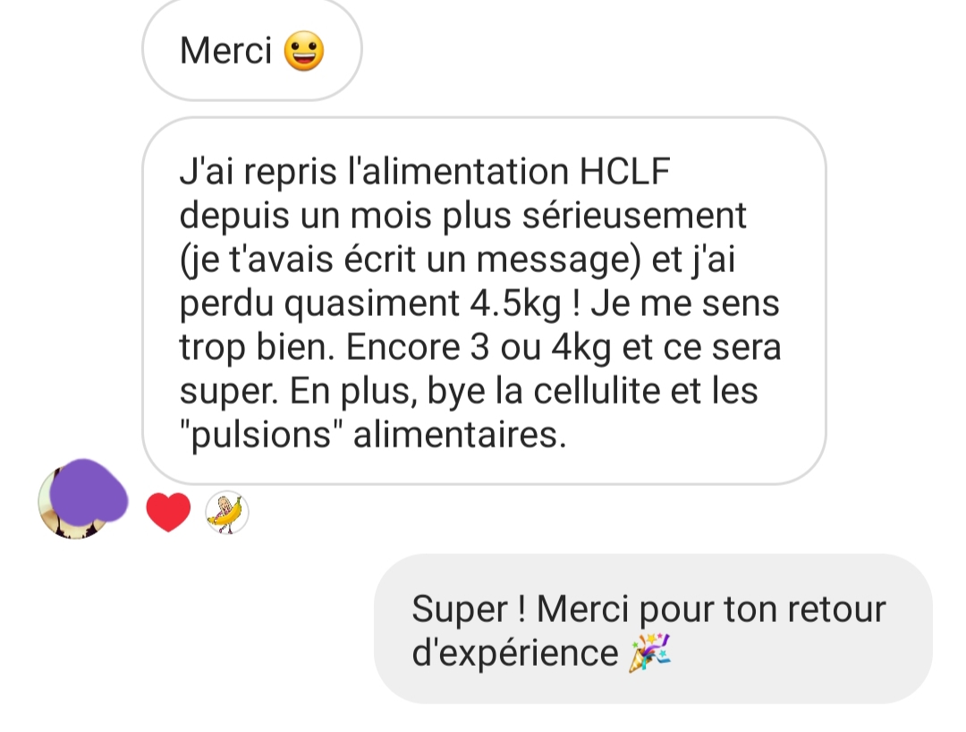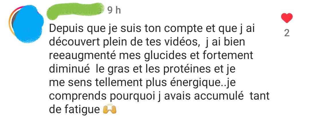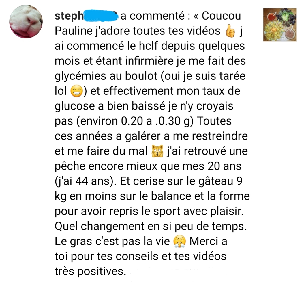 Ton mode de vie m’a permis de vivre sans penser aux calories, moi qui était glucophobe et flippais de grossir. Je suis de meilleure humeur et plus stable. Merci !