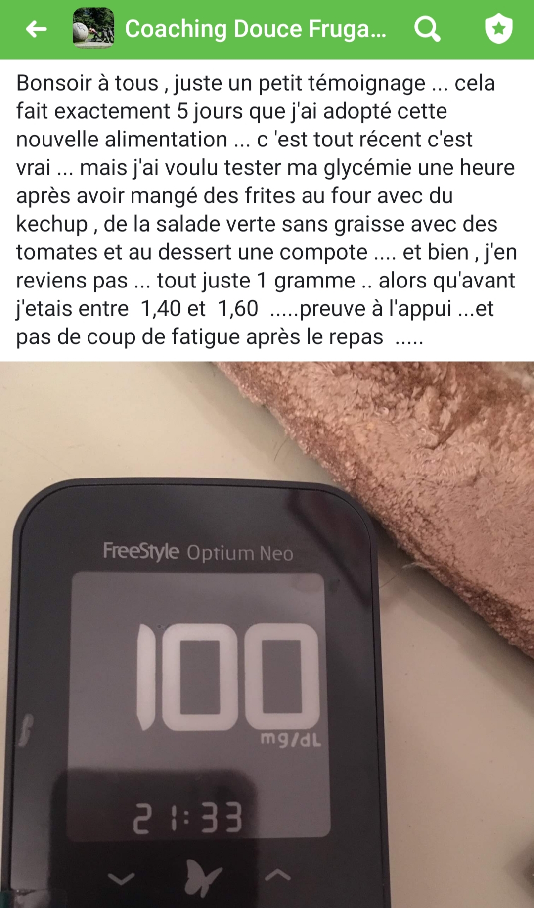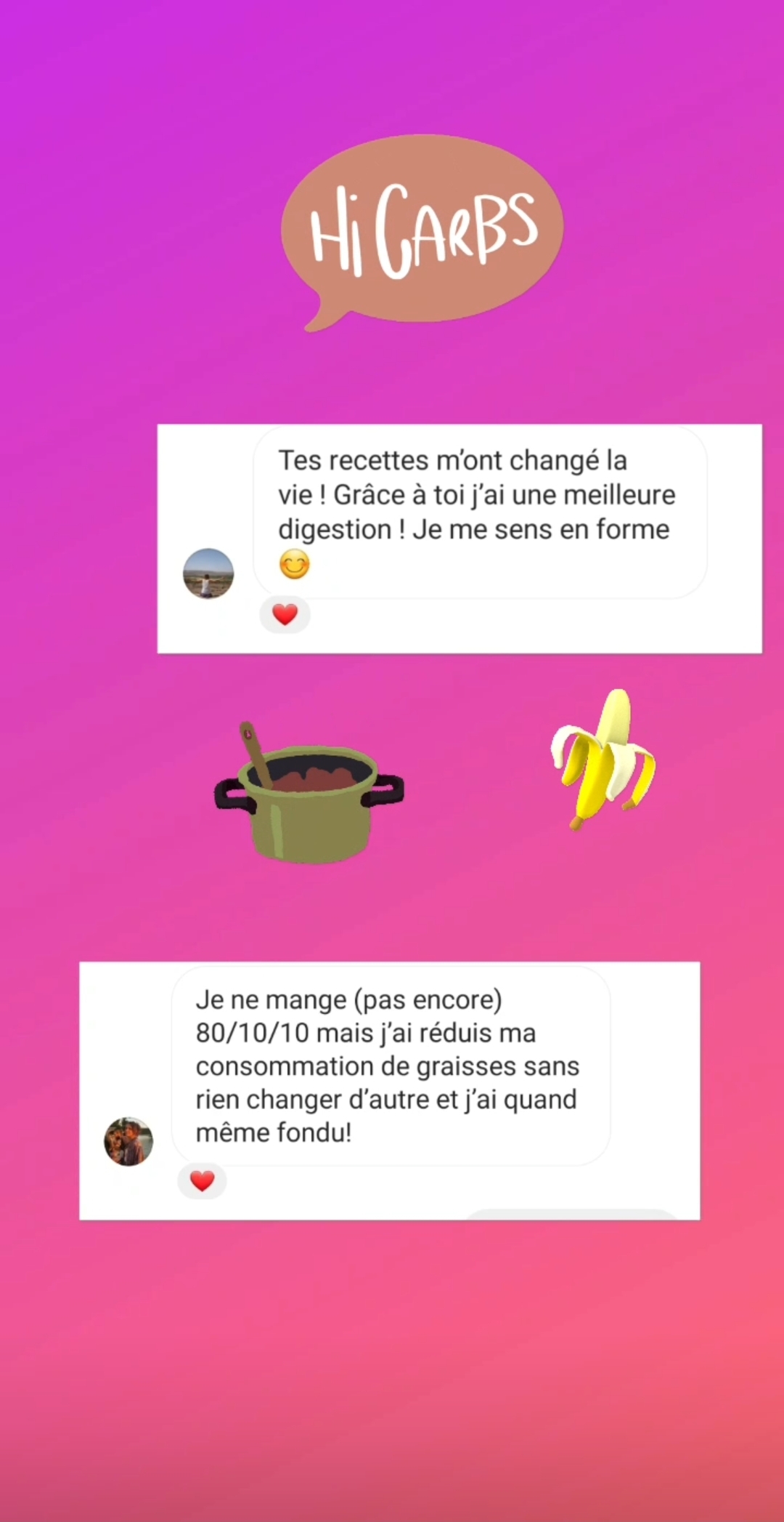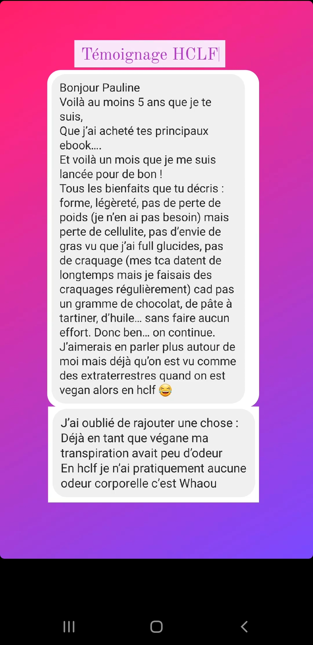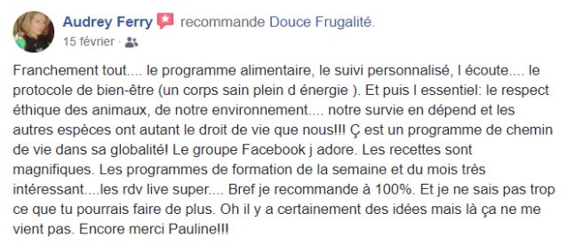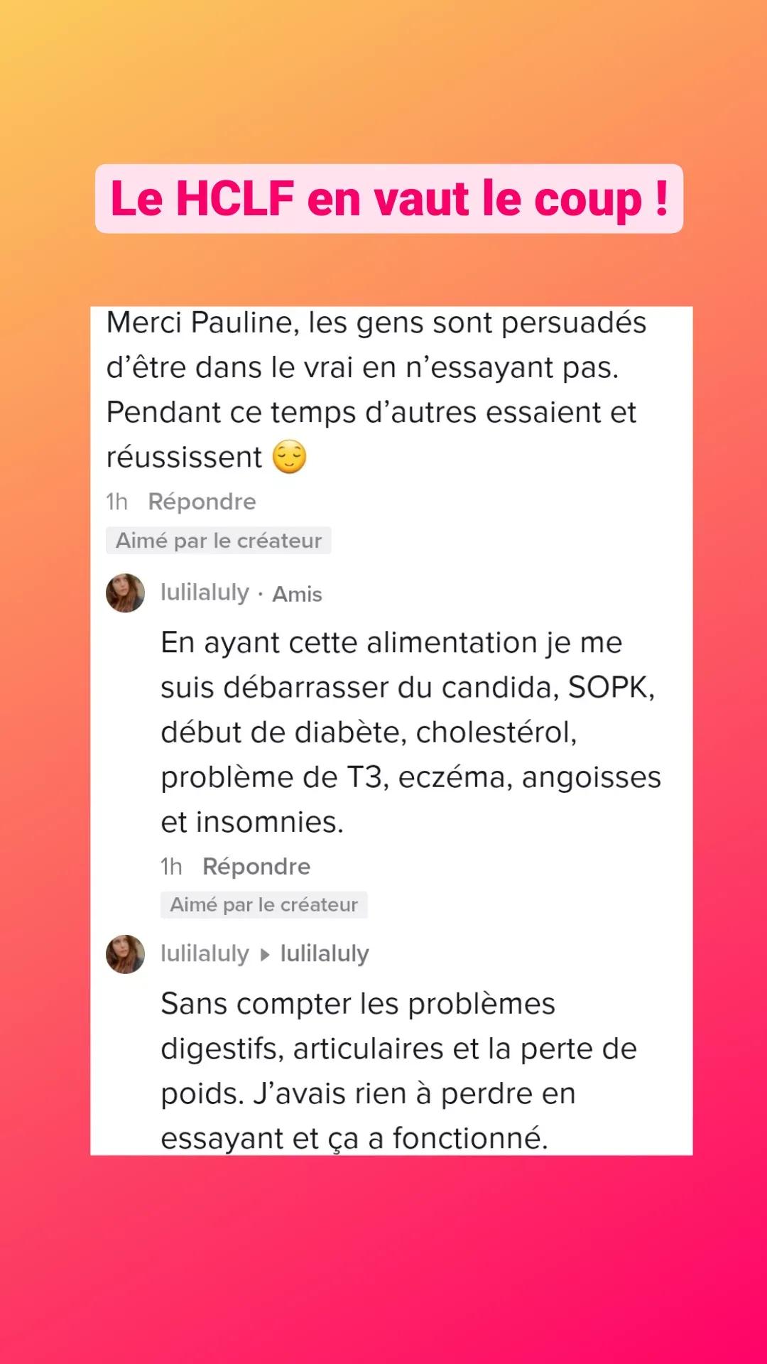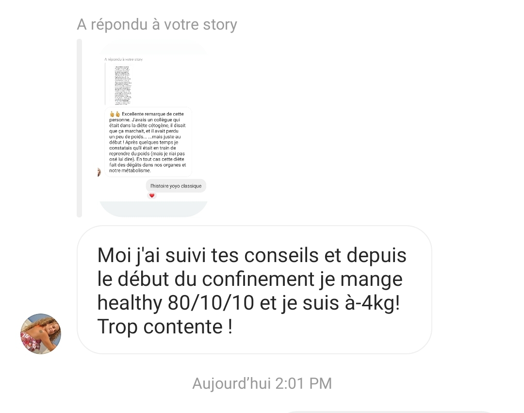 Ton mode de vie m’a permis de vivre sans penser aux calories, moi qui était glucophobe et flippais de grossir. Je suis de meilleure humeur et plus stable. Merci !