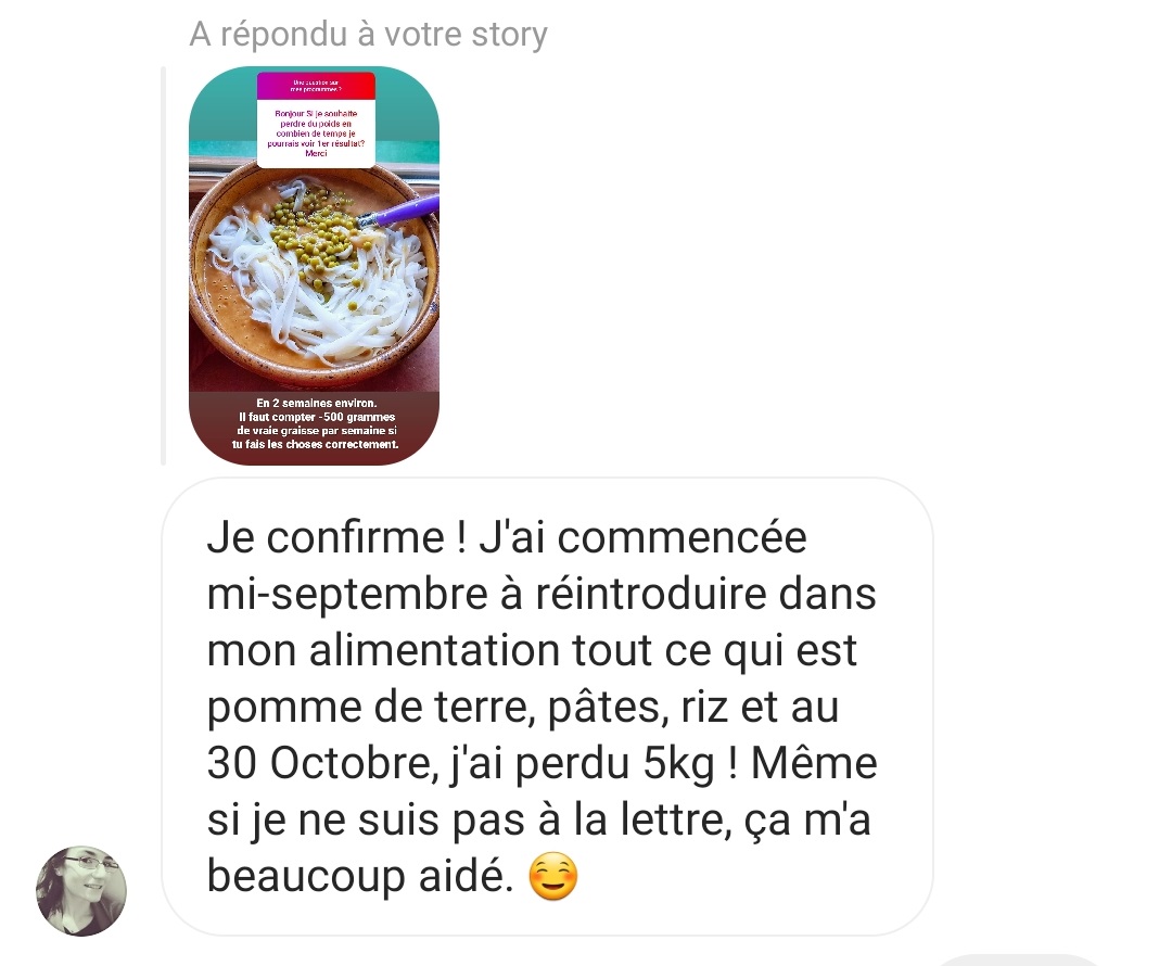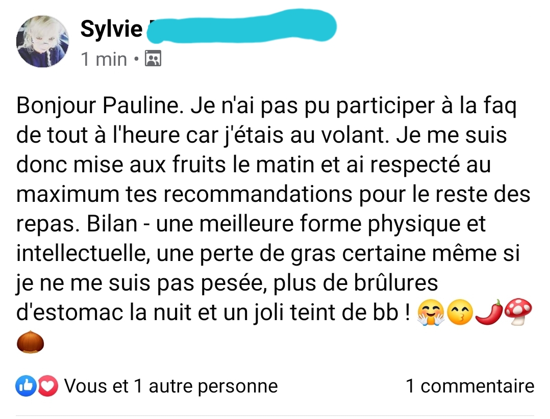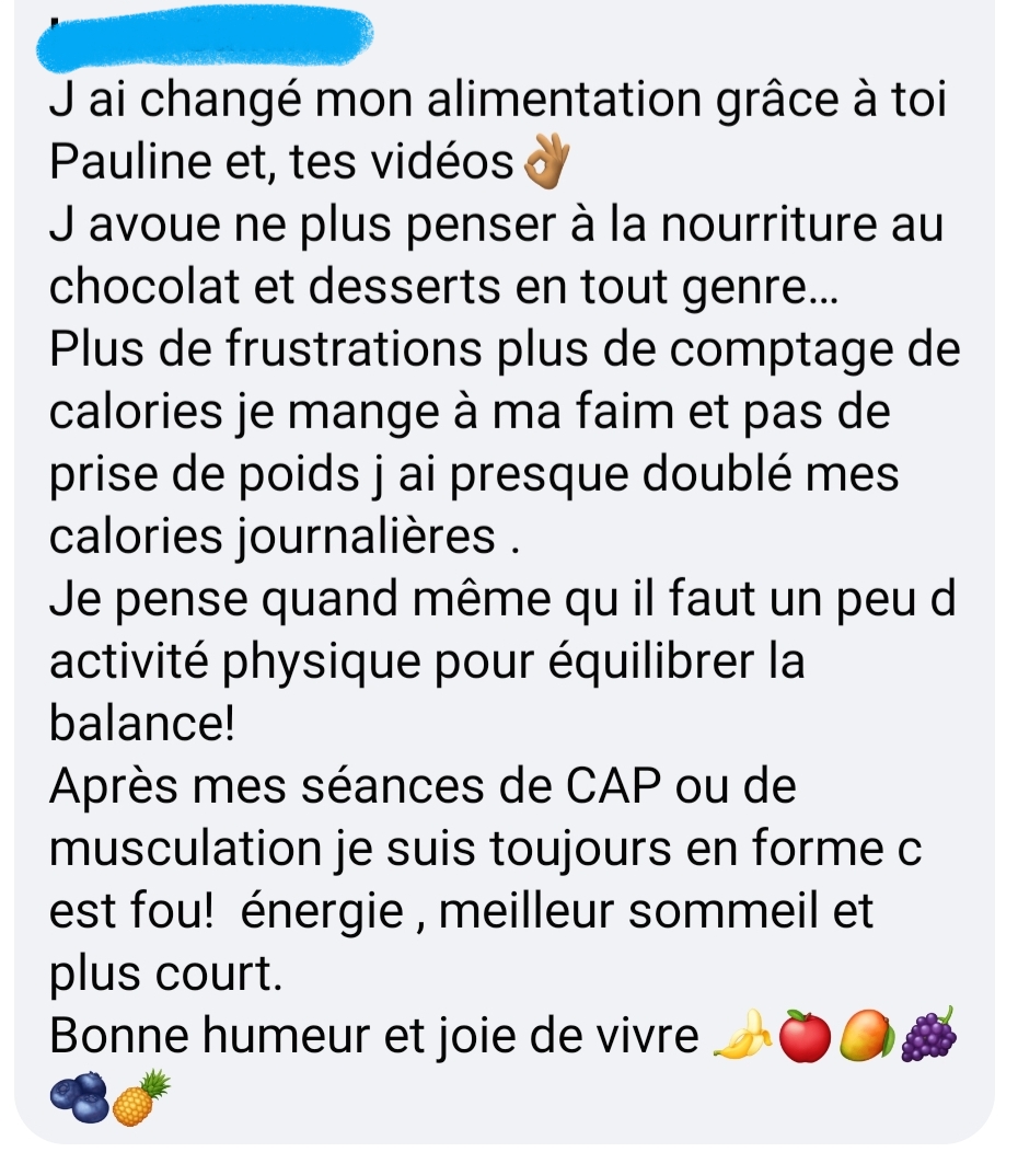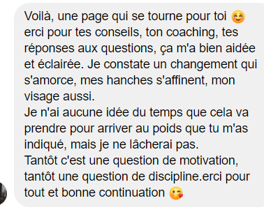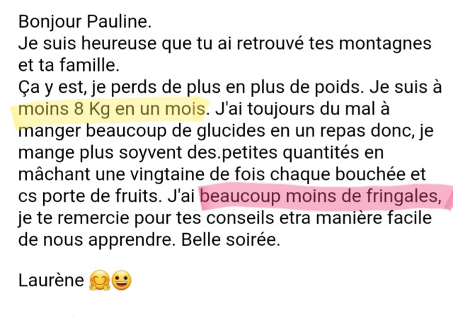 J’ai perdu 17 kg et pour la première fois de ma vie j’ai un poids stable. Merci Pauline!