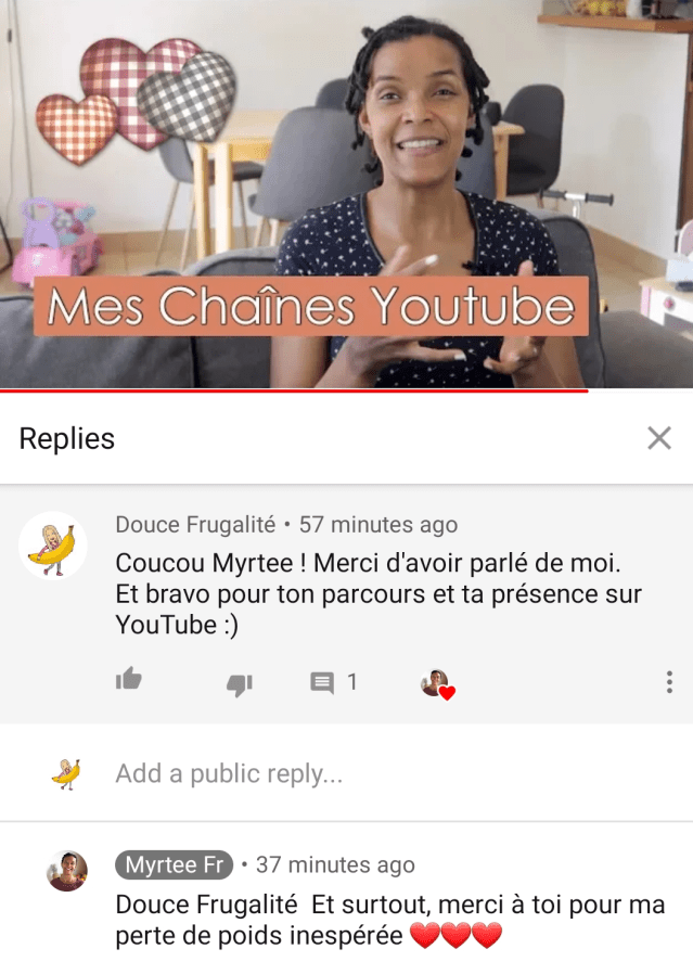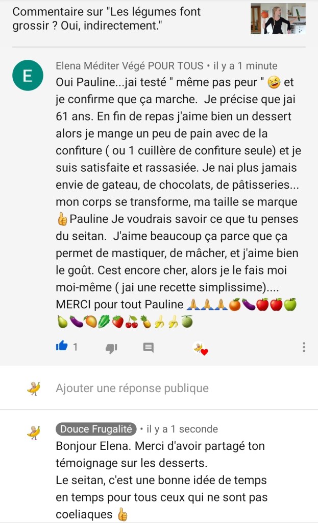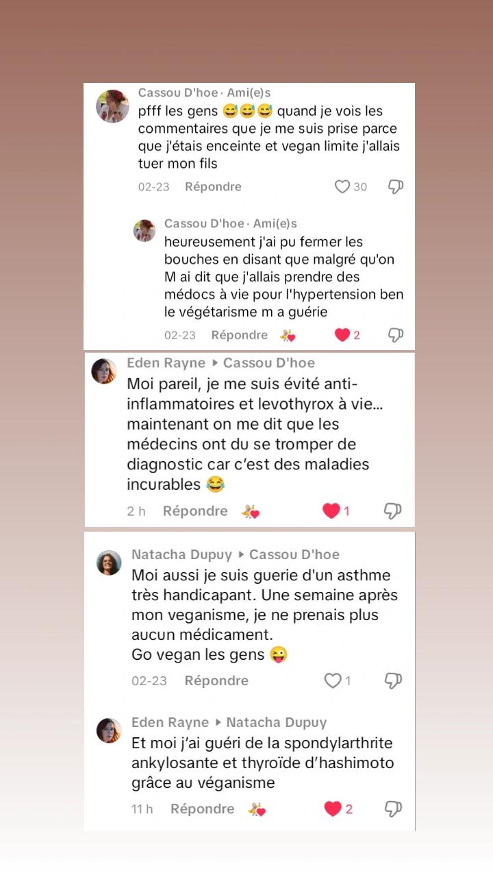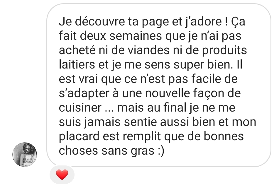 Un jour je suis tombée sur une de tes vidéos YouTube que j’ai adorée, je me suis abonnée, je t’ai beaucoup regardé, et moi qui n’aimais pas beaucoup la viande j’ai décidé de franchir le pas vers tout d’abord une alimentation végétarienne.