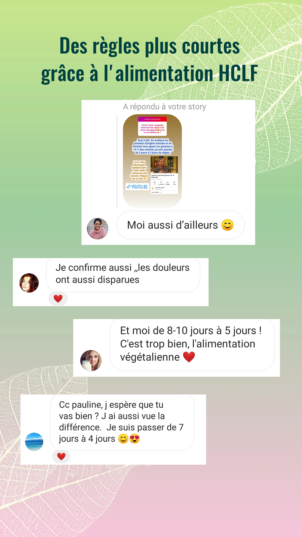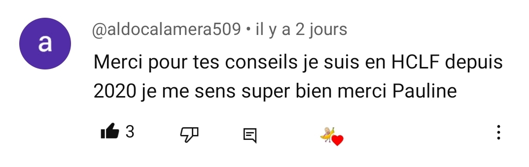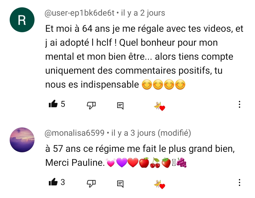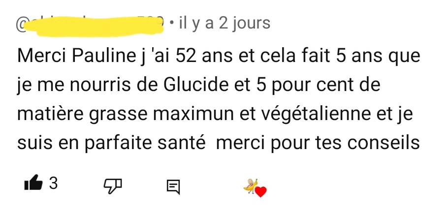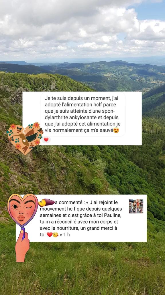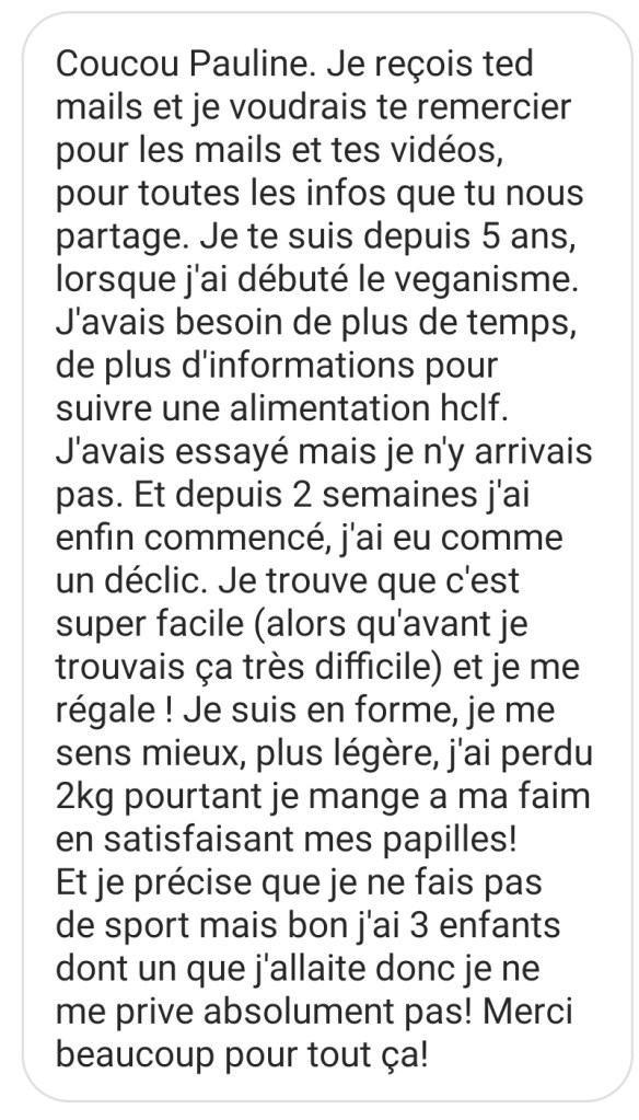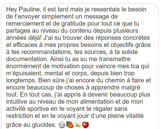Salut Pauline. Depuis le temps que je te suis, il était temps que je te remercie pour le contenu que tu partages depuis des années. Après des années de TCA dont 2 ans d’aménorrhée, j’ai appris à ne plus avoir peur des fruits et des glucides ! C’est incroyable comment le régime VG et HCLF est merveilleux. Plus d’énergie, une digestion facile et un super transit. J’essaye de partager toutes les connaissances que j’ai pu apprendre à mes proches désormais !