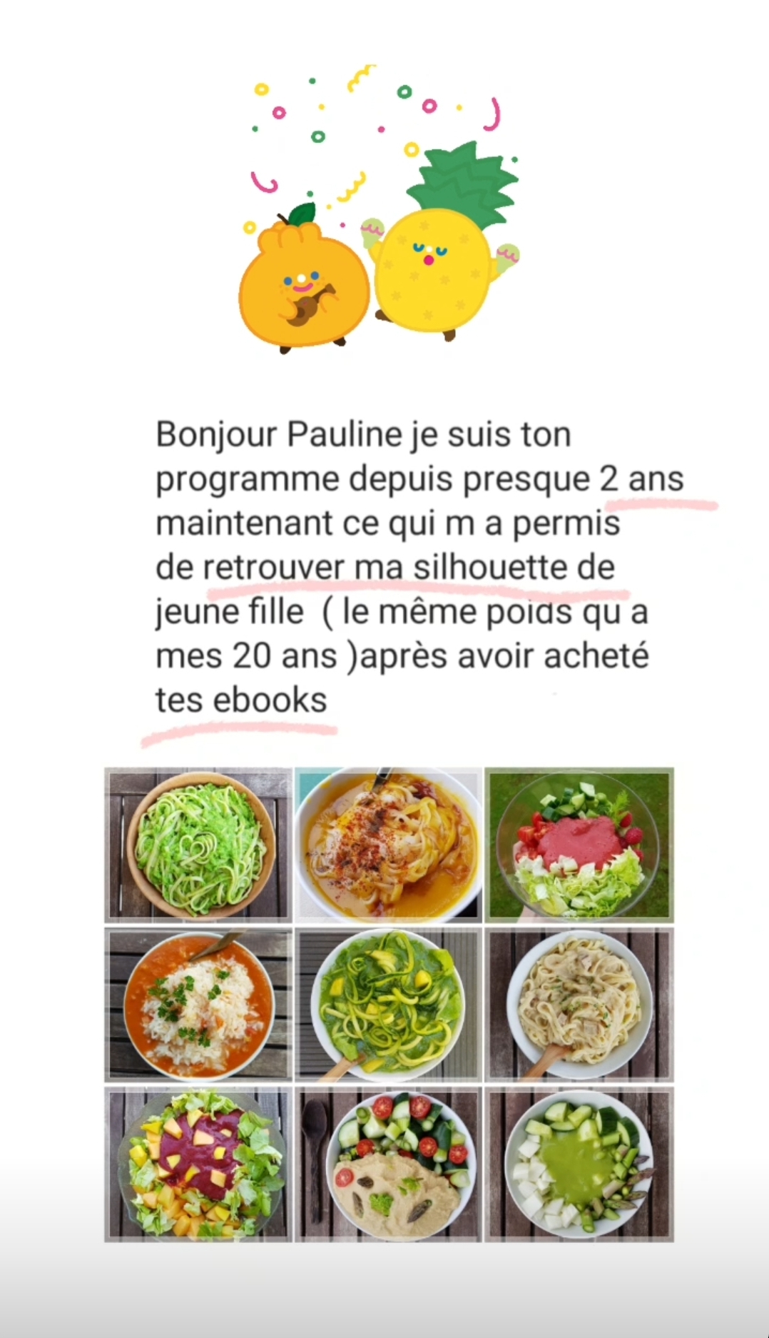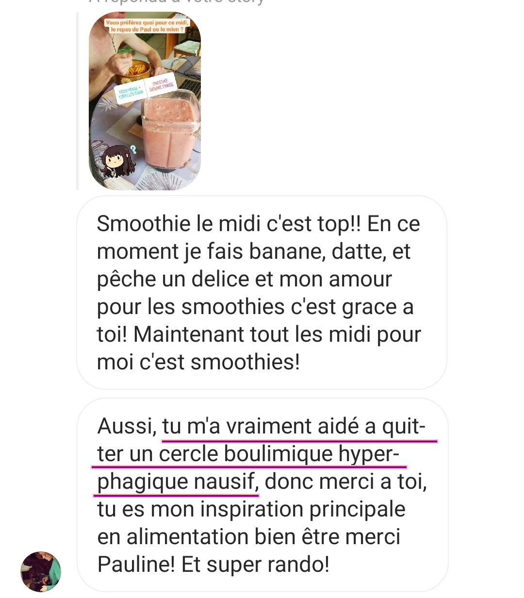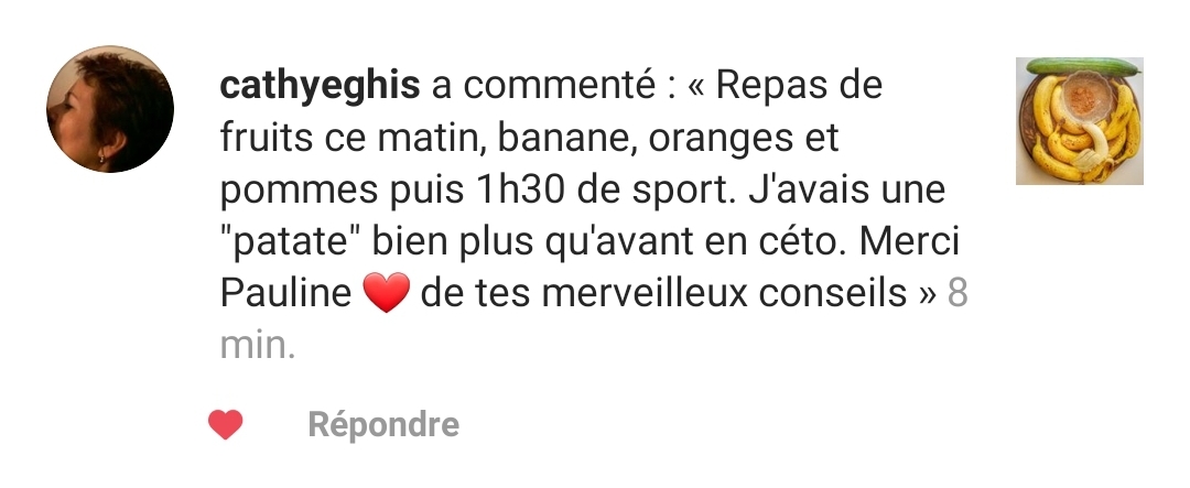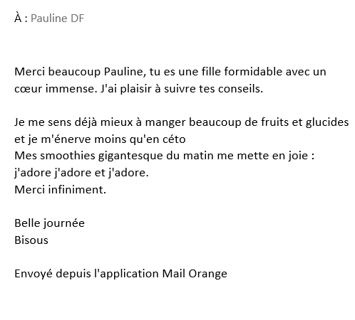 J’ai trouve un équilibre en mangeant comme toi, et de boire des smoothies que j’adore, d’ailleurs c’est grâce à toi que je mange comme toi, je fais beaucoup de sports, je ne ressens aucune fatigue lorsque je fais mes activités sportives. Alors merci Pauline.