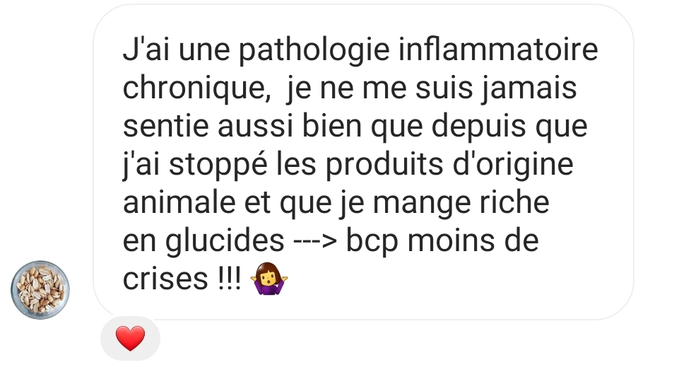En t’expliquant mon parcours un peu plus haut je ne me donne pas d’excuses, je me suis simplement égaré dans un cercle horriblement vicieux, mais comme quoi nous pouvons nous en sortir en ouvrant nos yeux et nos oreilles aux personnes qui ont des paroles telles que les tiennes. Aujourd’hui je suis repassée à une alimentation riche en glucide et pauvre en graisse et en protéine (adieu la consommation quotidienne d’oléagineux, bye bye je suis mieux sans vous)