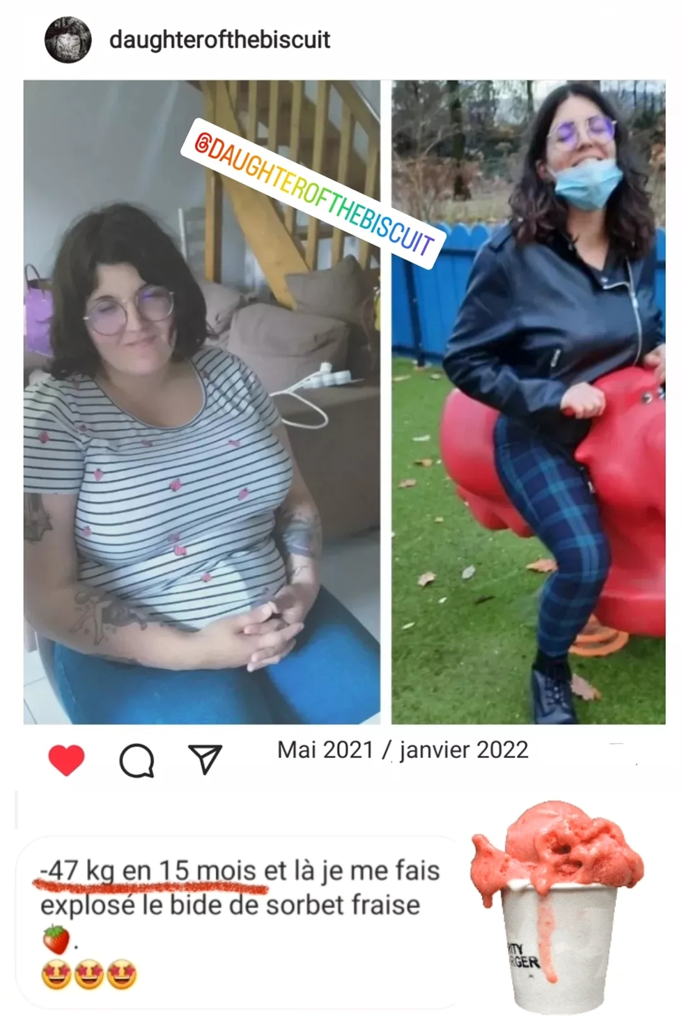 Tu m’as apporté la paix avec mon corps. L’autre jour, on regardait nos photos de vacances avec ma mère. J’ai eu tellement de peine pour cette ancienne moi qui était perdue, qui ne s’aimait pas mais qui ne savait pas comment faire pour aller mieux. Aujourd’hui, quand je me vois en photos, je ne vois qu’une fille amincie, qui se sent bien dans son corps, dans sa tête, dans ses idées et ses croyances… Tu m’as beaucoup aidée au début de ma transition, aidé à croire que j’étais sur le bon chemin, que le sucre n’est pas mauvais, que le gras l’est. Merci Pauline