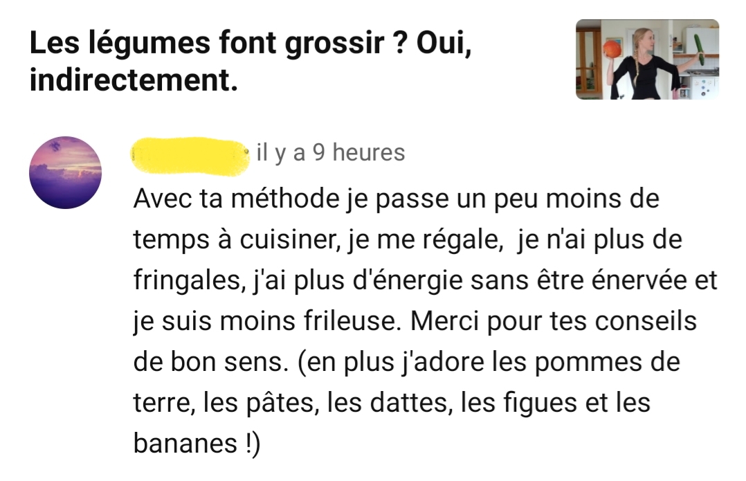 Tu m’as appris à ne plus avoir peur du sucre et des glucides en général et j’ai retrouvé mon énergie. Maintenant je cuisine sans huile et je digère mieux.