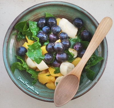 Salade de raisins, mangue, mini-bananes et épinards